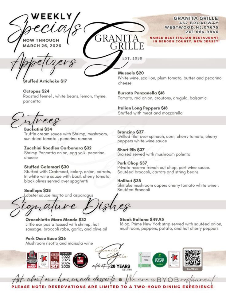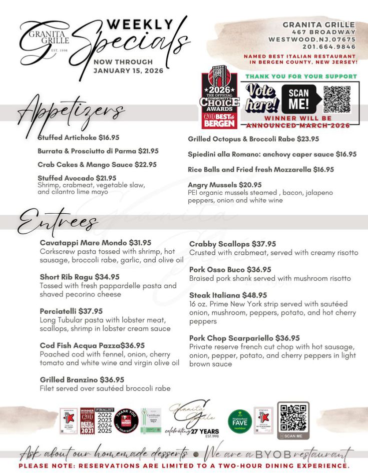 Granita Grille has been named one of the best restaurants in Westwood in 2024! Restaurantji prides itself on recognizing the best restaurants in the industry, and we are honored that Granita Grille has truly stood out among the rest.