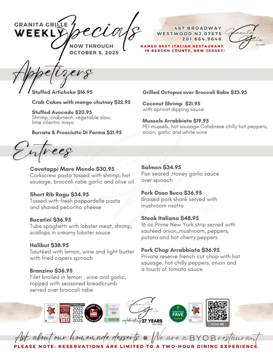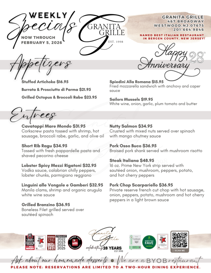 For the past 22 years, Granita Grille has been a Westwood, NJ, mainstay, serving up savory homemade Italian food to our community. When you walk through our doors, our goal is to give you a genuine Italian experience, from our 100% handmade dishes to our famous hospitality. Because of this, Granita Grille has been a local favorite since our doors opened. Come see why we continue to be the go-to destination for family dinner night, date night, special events, and more!