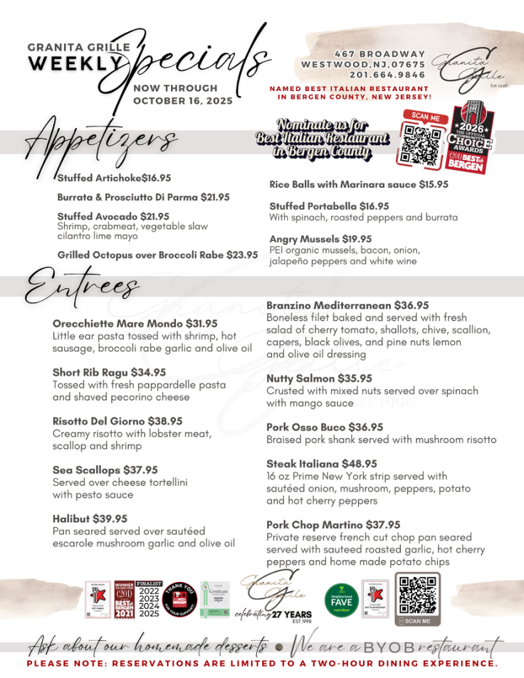 Nominate Granita Grille for Best Italian Restaurant in (201) Magazine’s Best of Bergen 2026!