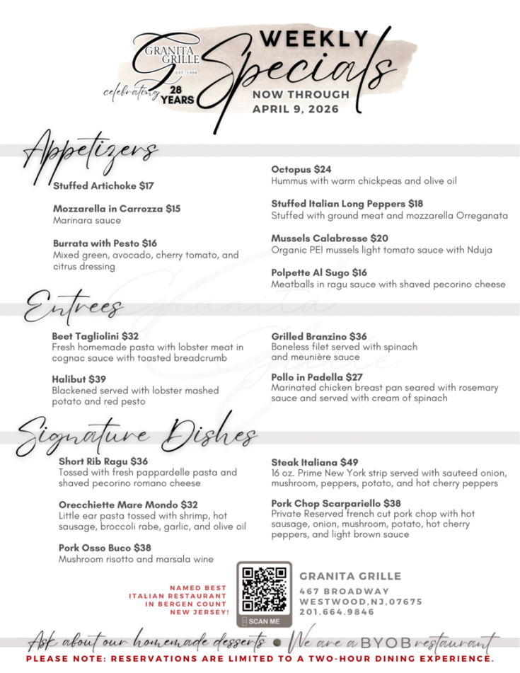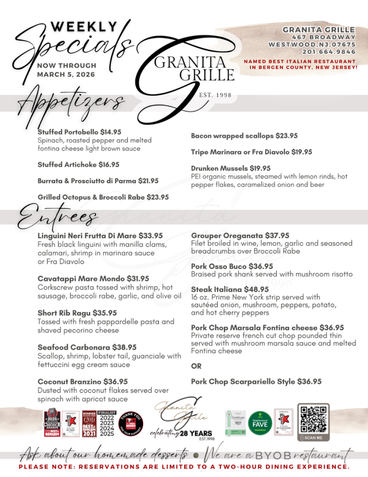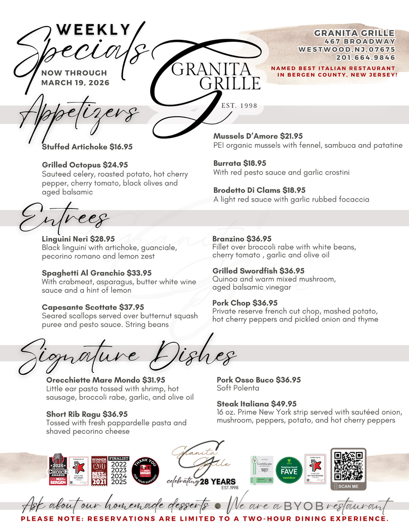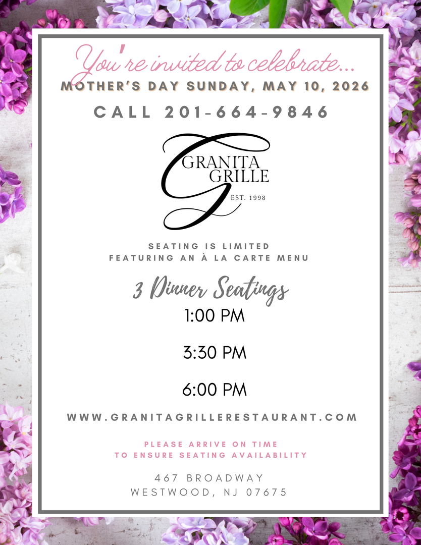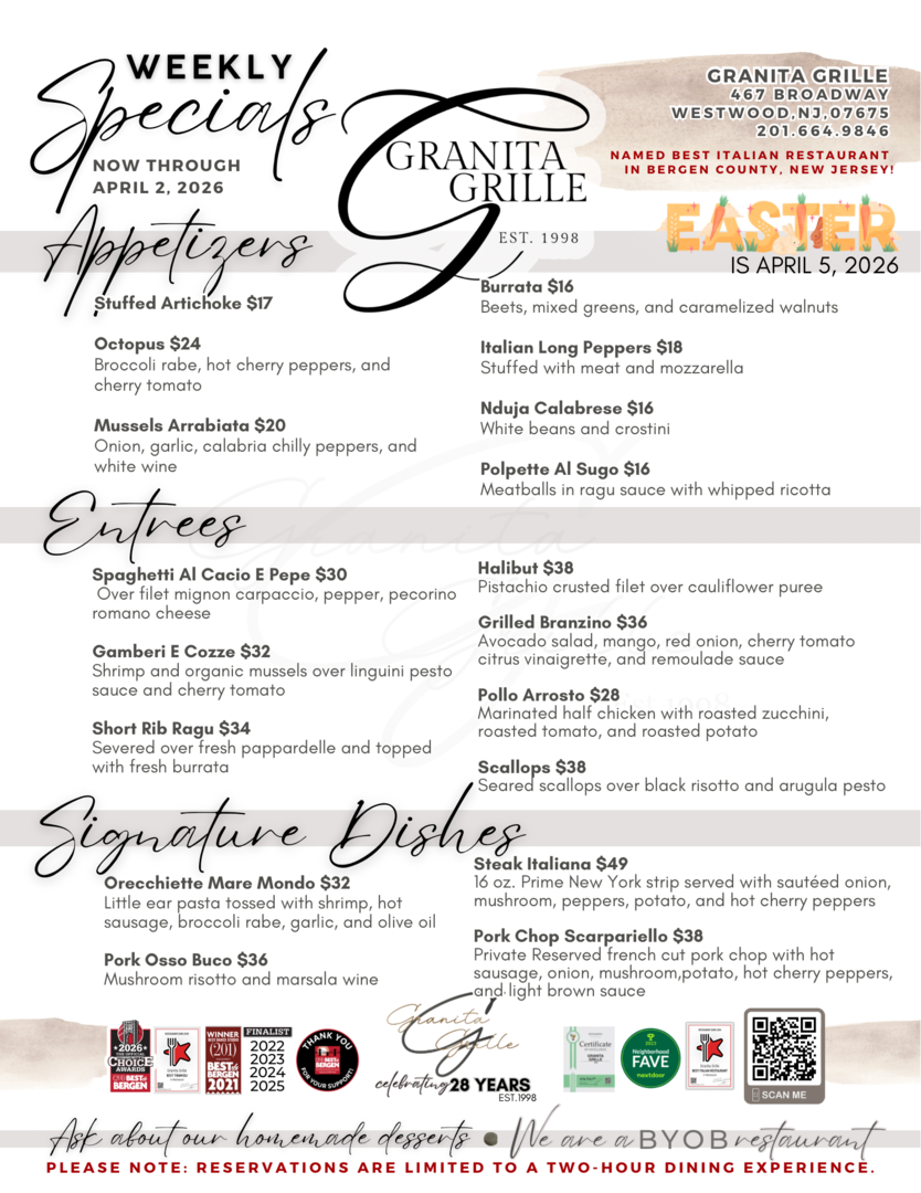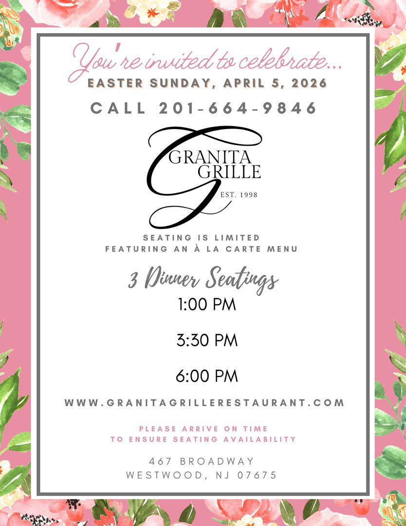 For the past 28 years, Granita Grille has been a Westwood, NJ, mainstay, serving up savory homemade Italian food to our community. When you walk through our doors, our goal is to give you a genuine Italian experience, from our 100% handmade dishes to our famous hospitality. Because of this, Granita Grille has been a local favorite since our doors opened. Come see why we continue to be the go-to destination for family dinner night, date night, special events, and more!