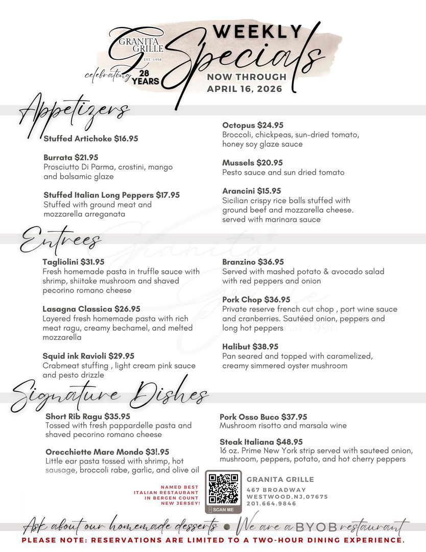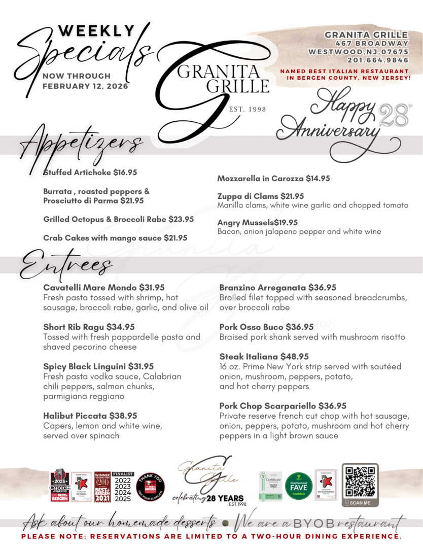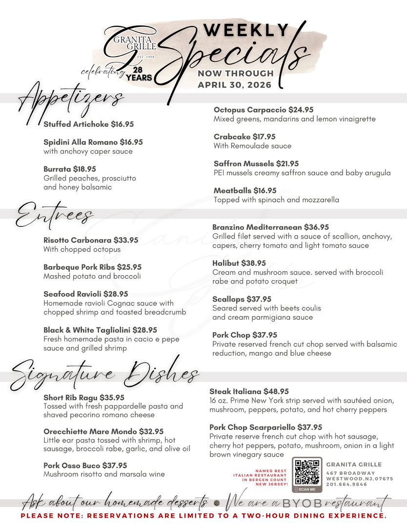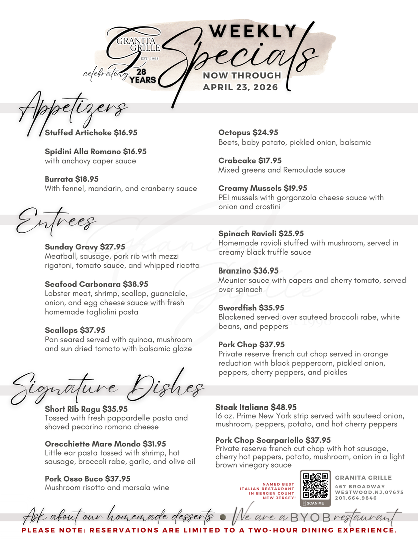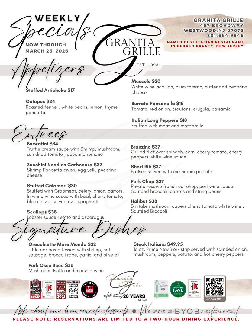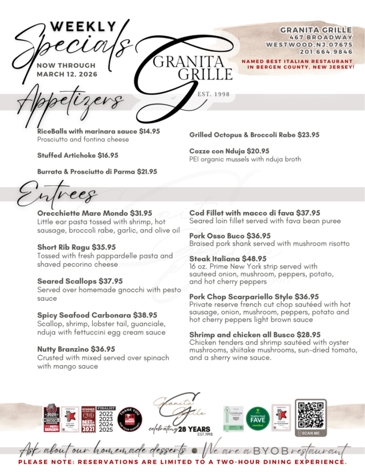 For the past 28 years, Granita Grille has been a Westwood, NJ, mainstay, serving up savory homemade Italian food to our community. When you walk through our doors, our goal is to give you a genuine Italian experience, from our 100% handmade dishes to our famous hospitality. Because of this, Granita Grille has been a local favorite since our doors opened. Come see why we continue to be the go-to destination for family dinner night, date night, special events, and more!